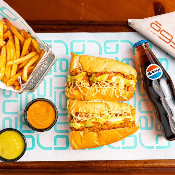 ساندويتش الدجاج المقلي مع سلطة والكولسلو وسلطة الطماطم وصوص كرسبي والجبنة الفاخرة